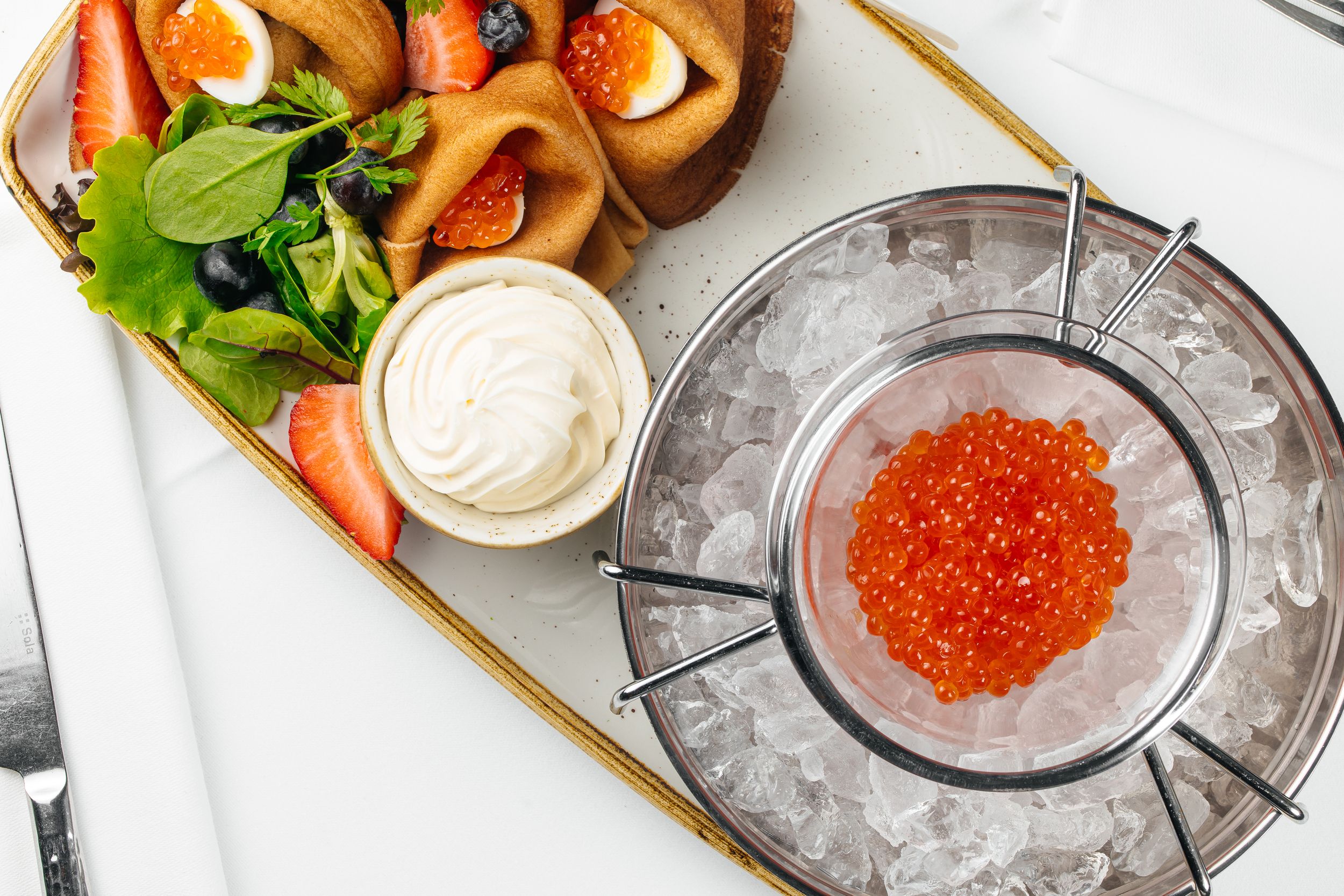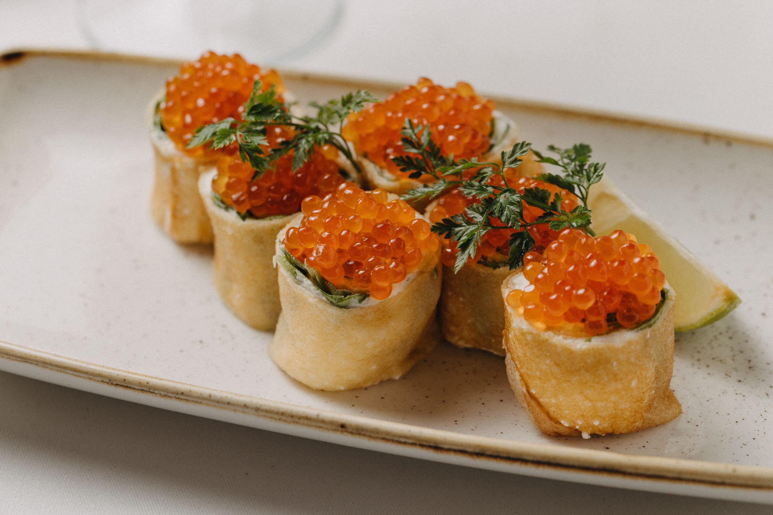 - Crêpes-Roll with premium salmon caviarcream cheese, spinach, avocado